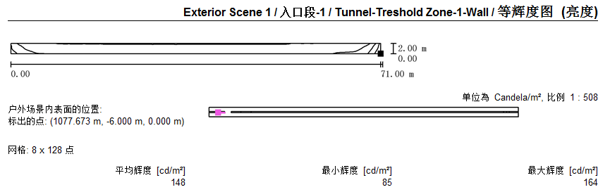 2)隧道各段燈具布置及照度模擬值:
